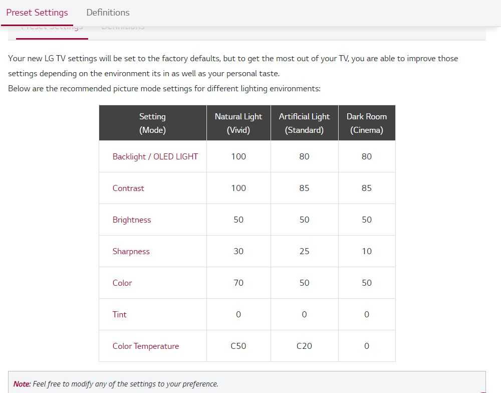 Для справки, следующая таблица иллюстрирует уровни настройки, предлагаемые LG при типичных условиях освещения.