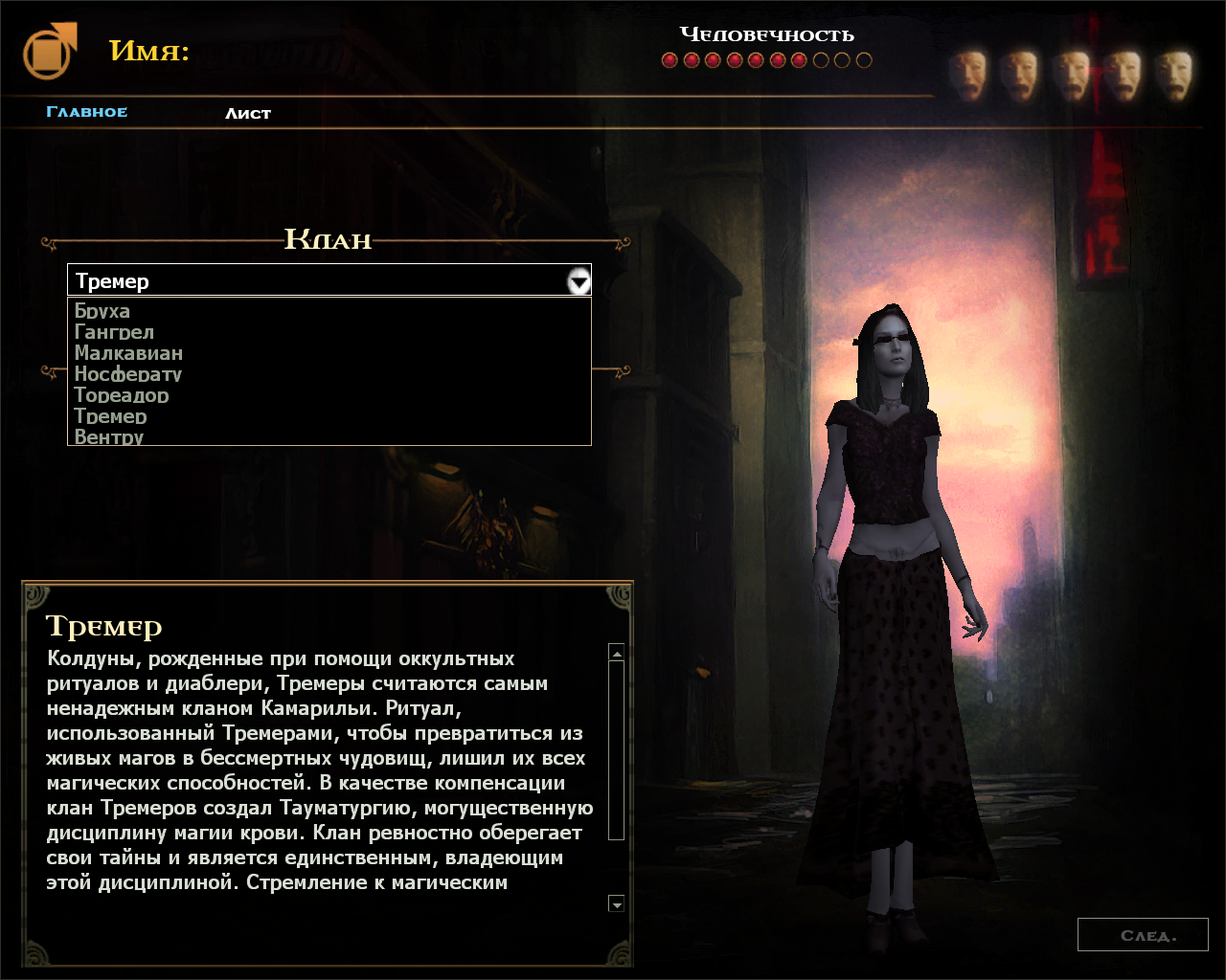 - Клан: Клан вашего персонажа, который показывает его происхождения и родство с Каином, первым вампиром. От клана зависят силы и слабости вампира.