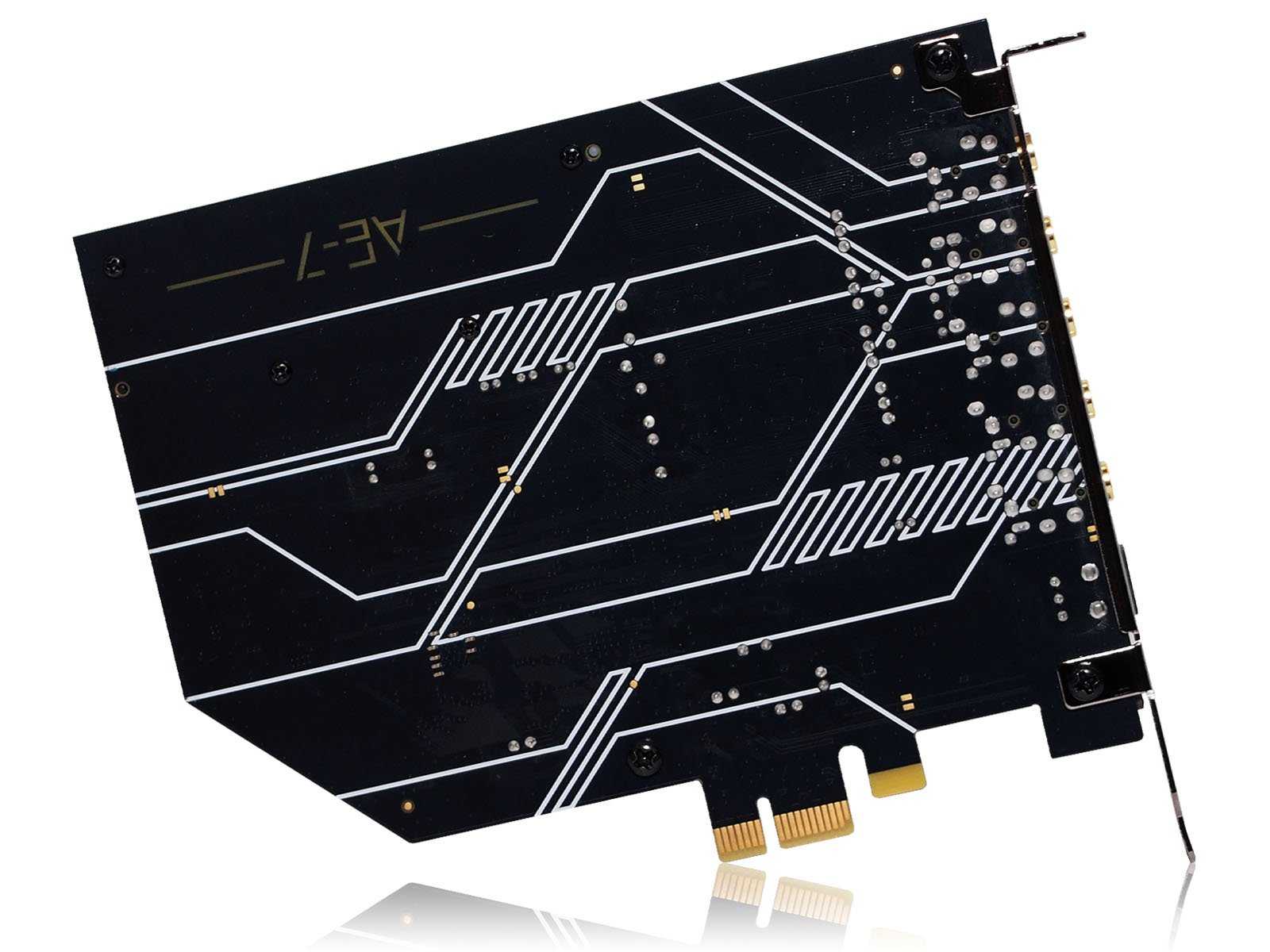 Обратная сторона платы являет собой черный текстолит, украшенный узорами белого цвета. Крупная надпись AE-7 на текстолите полупрозрачная, и белый свет с другой стороны платы, проходя через неё, создаёт эффект лёгкого жёлтого свечения. В целом выглядит свежо, а учитывая глянцевую поверхность и отражение RGB-подсветки соседних плат на тёмной поверхности, плата хорошо смотрится в корпусе ПК.