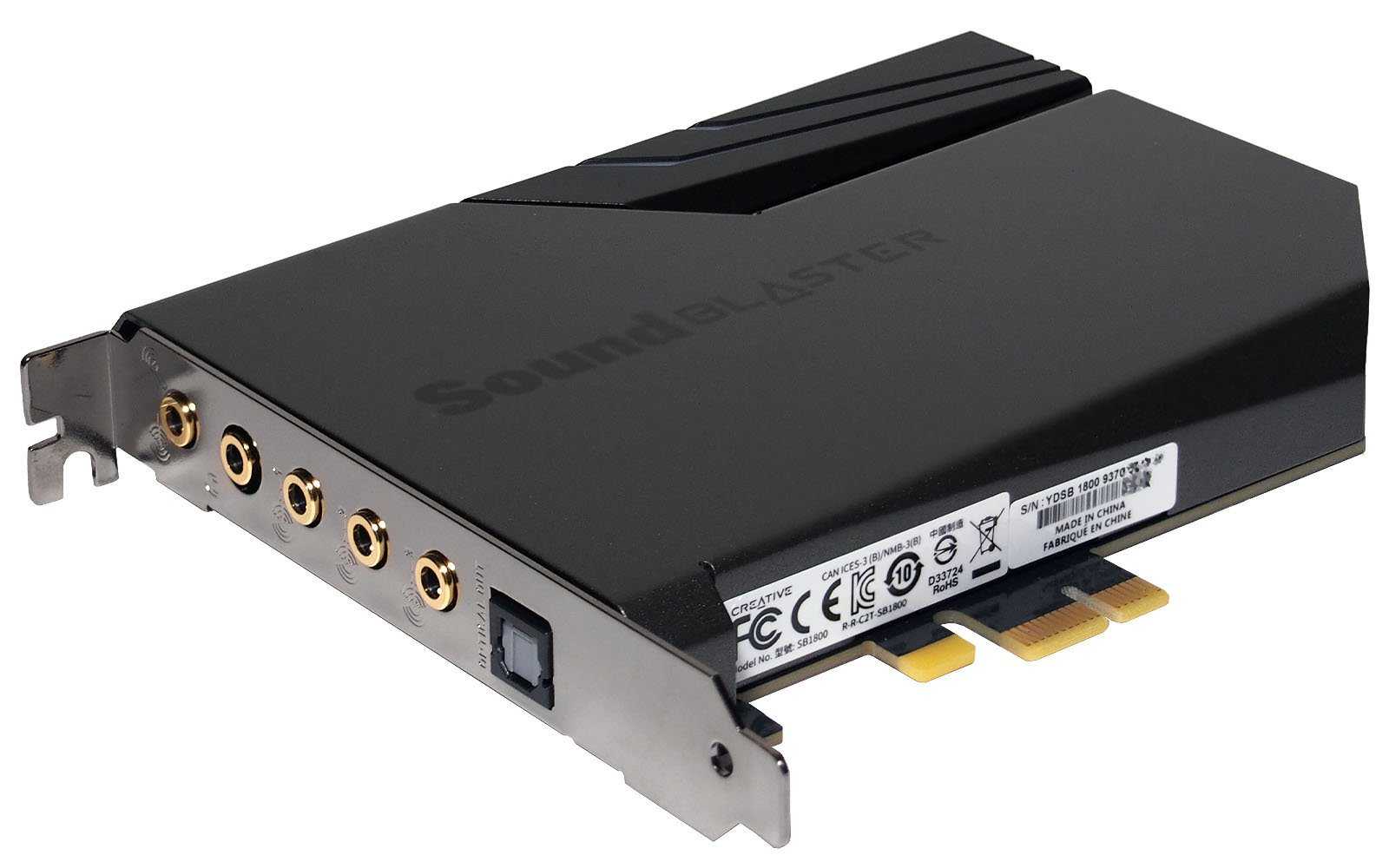 Основная плата Sound Blaster AE-7 имеет относительно небольшие габариты. Она полностью закрыта металлическим кожухом, который одновременно добавляет визуальной эстетики и играет роль экрана от emi-помех, снижая наводки от соседних комплектующих. Наклейки со служебной информацией закреплены на нижней части, обращенной к слоту PCIe, поэтому портить вид аккуратной сборки в корпусе с прозрачными стенками не будут.