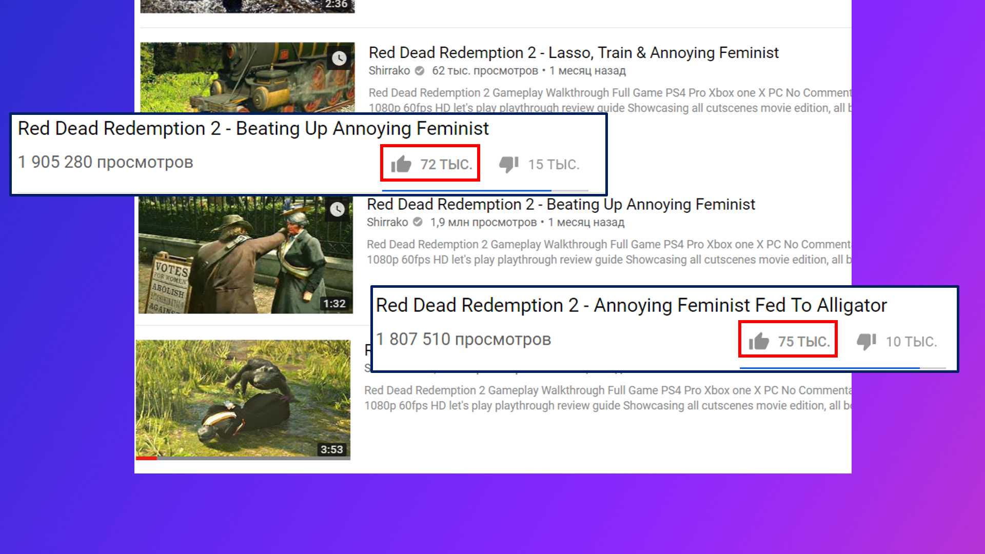 Современные анти-феминисты любят говорить, что вот суфражисток еще можно понять, а сейчас феминисткам не за что бороться. Но правда в том, что они ненавидят всех феминисток, и суфражисток тоже. В игре Red Dead Redemption 2, которая вышла 26 октября этого года, можно бить других неиграбельных персонажей. Один пользователь воспользовался этим и сделал целую подборку видео, где он избивает, тащит лассо, скармливает аллигатору, кладет под поезд «надоедливую» феминистку. Видео набирают миллионы просмотров, тысячи лайков и одобрительных комментариев.