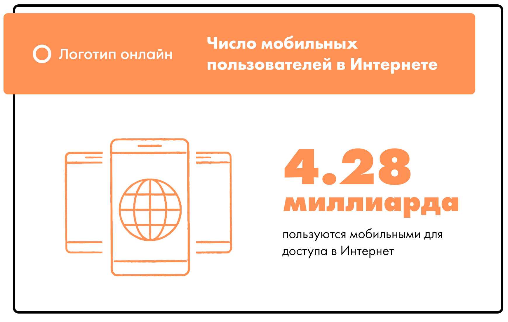 В настоящее время в мире насчитывается 4,28 миллиарда уникальных пользователей мобильного интернета, что составляет около 54,6 процента населения планеты (Statista, 2020).