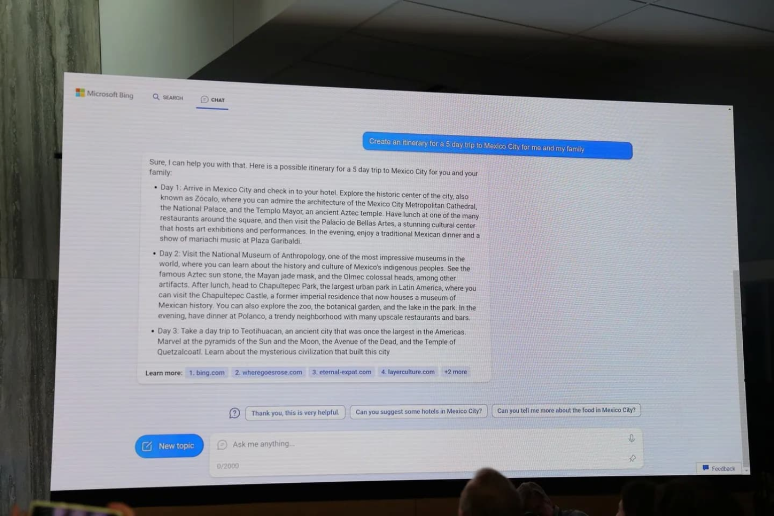 Чат с искусственным интеллектом. Из обычного поиска можно переключиться на интерфейс чат-бота и общаться с нейросетью напрямую. В качестве примера Microsoft попросила бота составить программу семейной поездки в Мехико на пять дней, а затем кратко пересказать её и разослать членам семьи по электронной почте.