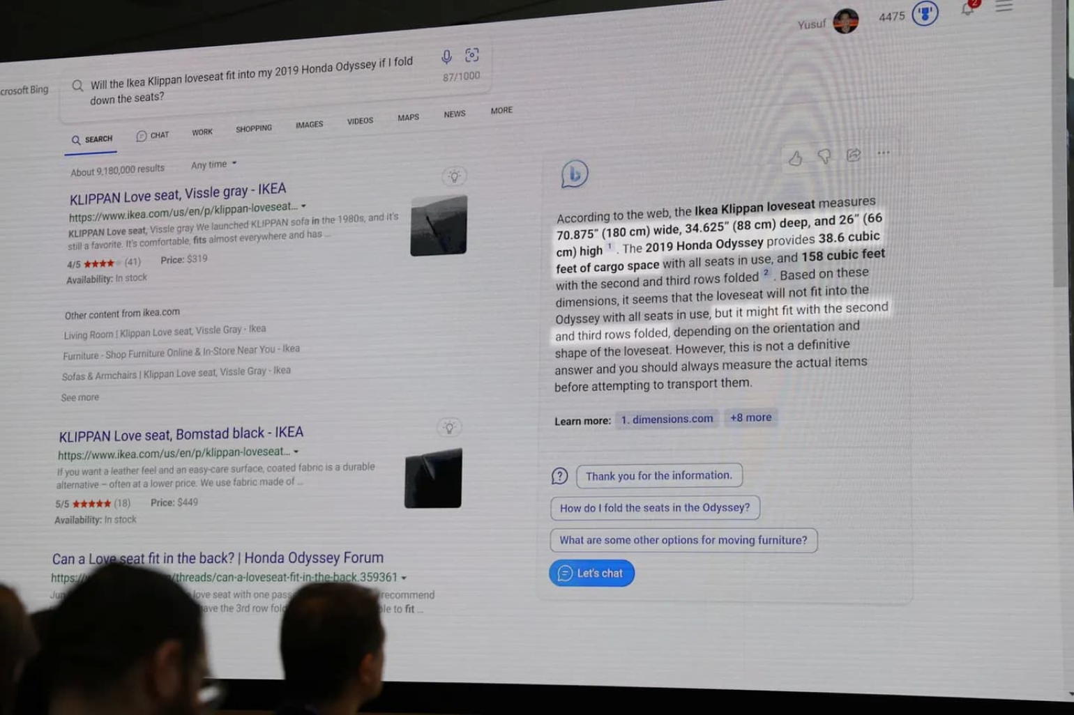 Поиск с умными ответами. В этом режиме рядом с обычной поисковой выдачей будет блок с подсказками от ИИ. То есть теперь можно задать поисковику нестандартный вопрос и получить развёрнутый ответ, дополненный идеями и подсказками. Например, спросить, поместится ли икеевский диван в минивэн Honda Odyssey: