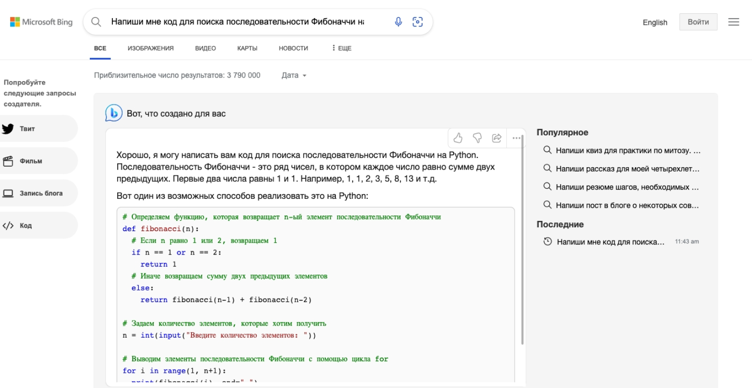 Или попросить написать Python-код для поиска последовательности Фибоначчи: