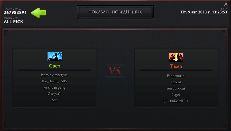 В верхнем левом углу – вы увидите номер матча. В нашем случае – это турнирная игра против OG под номером 4986461644. Копируем этот номер.