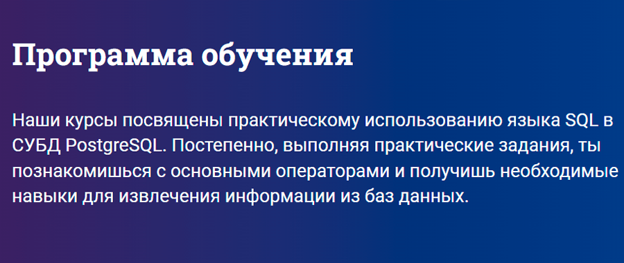 После прохождения бесплатной версии — понимать основы SQL и составлять простые запросы. После прохождения платной версии — составлять запросы различного уровня, умело взаимодействуя с данными через PostgreSQL.
