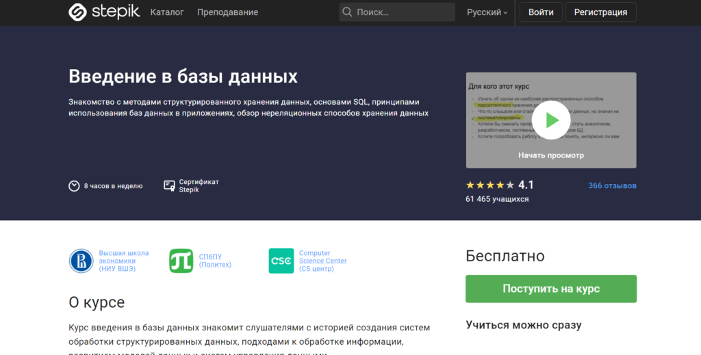 Курс разбит на 11 крупных тем, каждая из которых раскрывает отдельный аспект взаимодействия с базами данных и составления SQL-запросов.