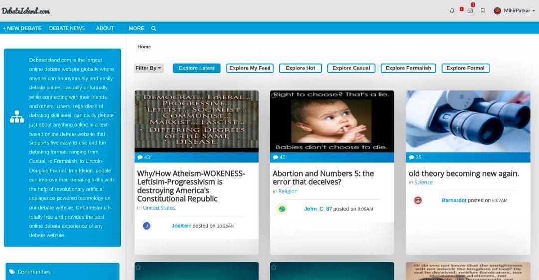 Debate Island предлагает пользователям создавать дискуссионные клубы, которые можно использовать даже в классе. На веб-сайте также есть прогноз ИИ под названием Дебра, который анализирует комментарии на предмет аргументов, источников, правил и поведения, а затем определяет, какой комментарий с наибольшей вероятностью победит в дебатах. Проверять Лучшие основные приложения для Windows для студентов.