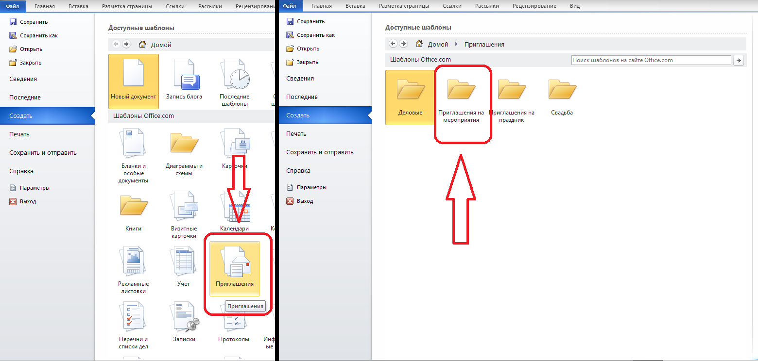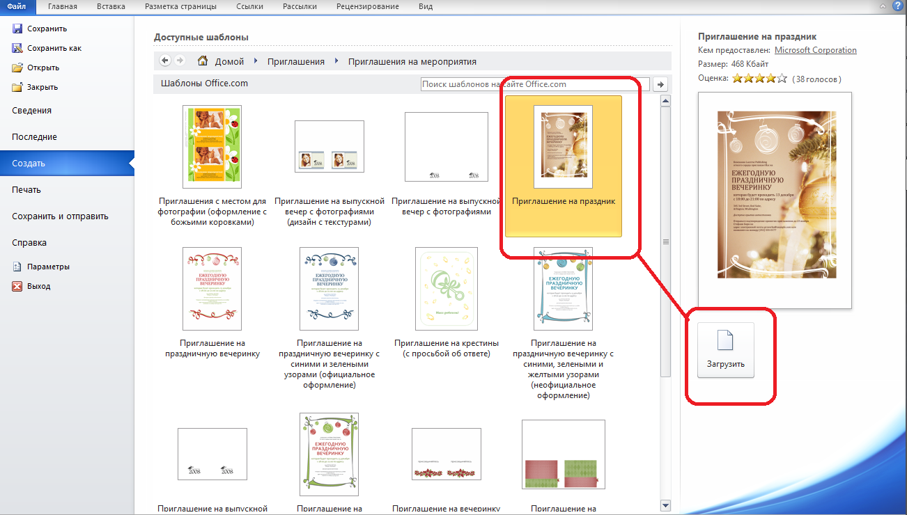 Для того чтобы открыть шаблон, достаточно кликнуть на соответствующую иконку и выгрузить шаблон в Word. Например путь Создать/Приглашения/Приглашения на мерприятия/Приглашение на праздник/Загрузить.