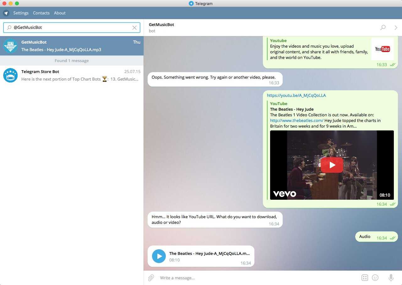 Другие два ценных источника музыки — это YouTube и SoundCloud. @GetMusicBot предназначен для работы с ними. Можешь отправить боту ссылку на страницу, и, немного подумав, он выдаст аудиофайл. Еще бот позволяет искать музыку, не покидая Telegram. Для поиска по YouTube есть команда , для SoundCloud — . Команда листает страницы выдачи. Интересно, что с YouTube можно скачивать не только аудио, но и видео. Неплохая замена для вышедшего из строя @iVideoBot.