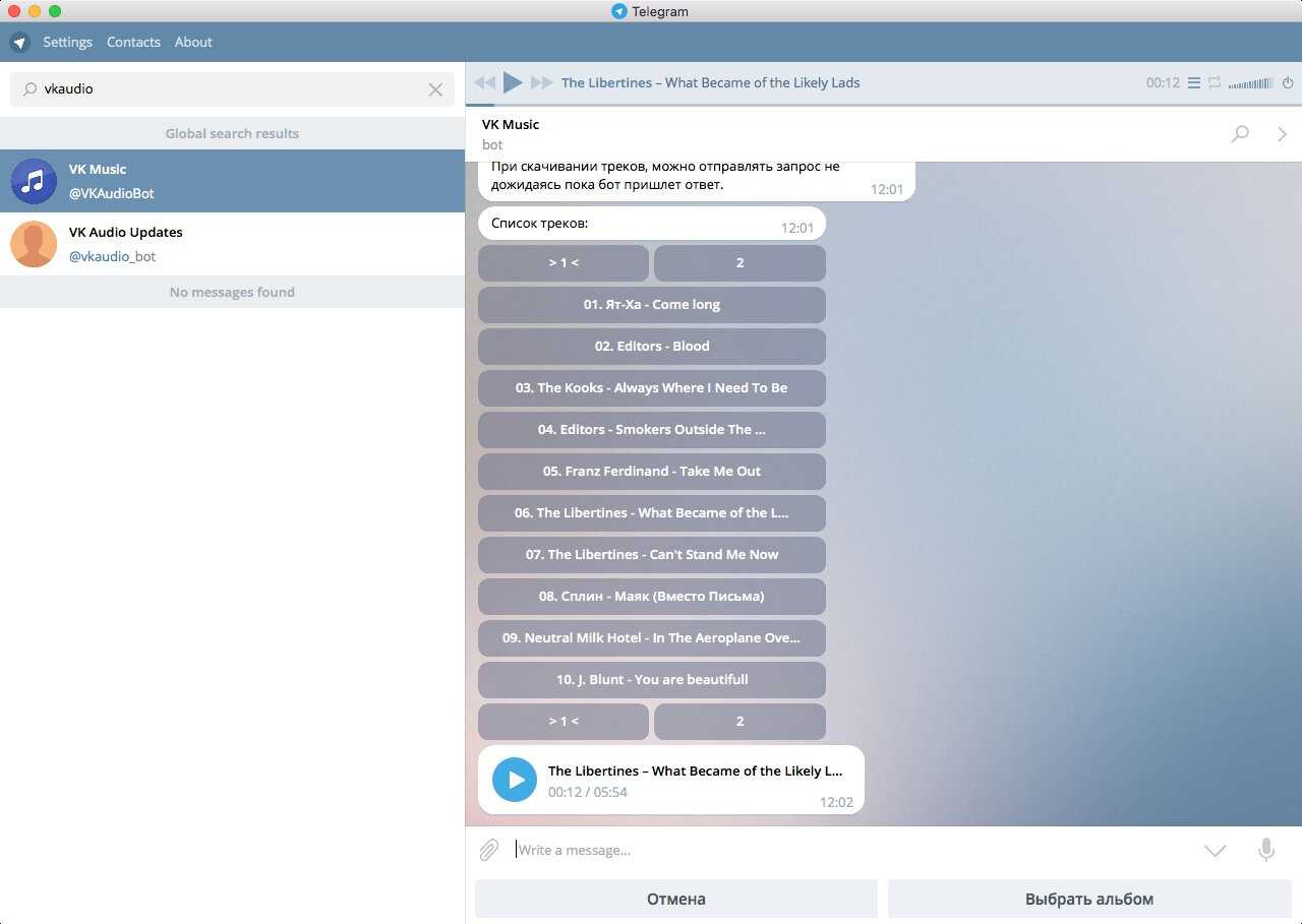 Скачивание музыки из «Вконтакте» — вечно актуальная тема. И конечно же, для этих целей существует бот. Он через API подключается к «Вконтакте» и запрашивает доступ к аудиозаписям. Подтвердив, можно жать кнопку «Мои аудиозаписи» и листать страницы с треками. Бот позволяет посмотреть добавленные альбомы (кнопка «Выбрать альбом») и плей-листы. Файлы можно скачивать или слушать прямо в «Телеграме». К сожалению, в версии Telegram для iOS бот заблокирован.