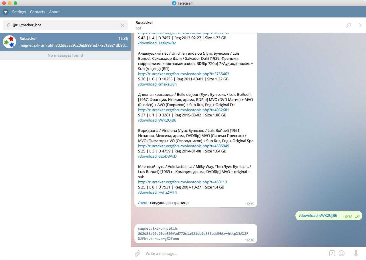 Многих других ботов можно обвинить в том, что они по функциональности не дотягивают до аналогичных сайтов. Но только не бот Rutracker.org! Это полноценная версия трекера, в которой можно искать (просто напиши запрос), сортировать выдачу (к примеру, команда отсортирует по количеству сидов, а — по размеру раздачи) и получать magnet-ссылки на торренты. Чтобы запросить magnet link, найди в выдаче под описанием интересующей раздачи ссылку вида и просто нажми на нее. Не хватает разве что возможности выбрать раздел для ограничения поиска.