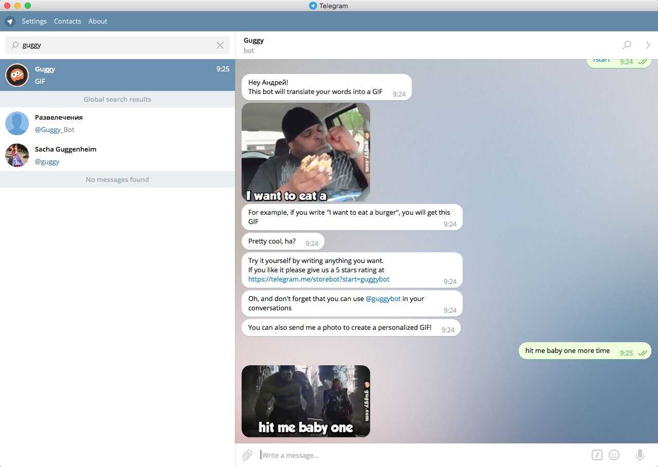 Напоследок — чисто развлекательный, но интересный бот. Пишешь ему любую строчку, а он накладывает ее на анимированный GIF. Интересная особенность заключается в том, что гифка обычно имеет некоторую связь с тем, что написано, причем даже если писать по-русски. Польза, конечно, сомнительна, зато весело.