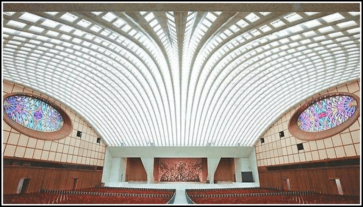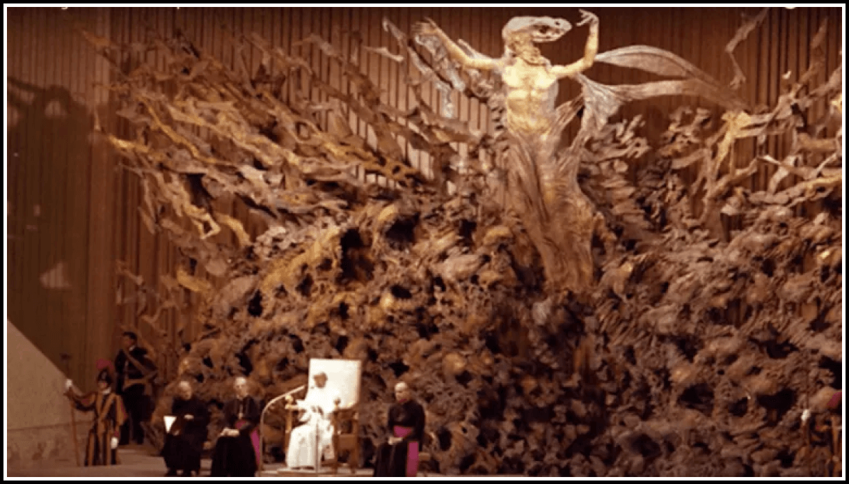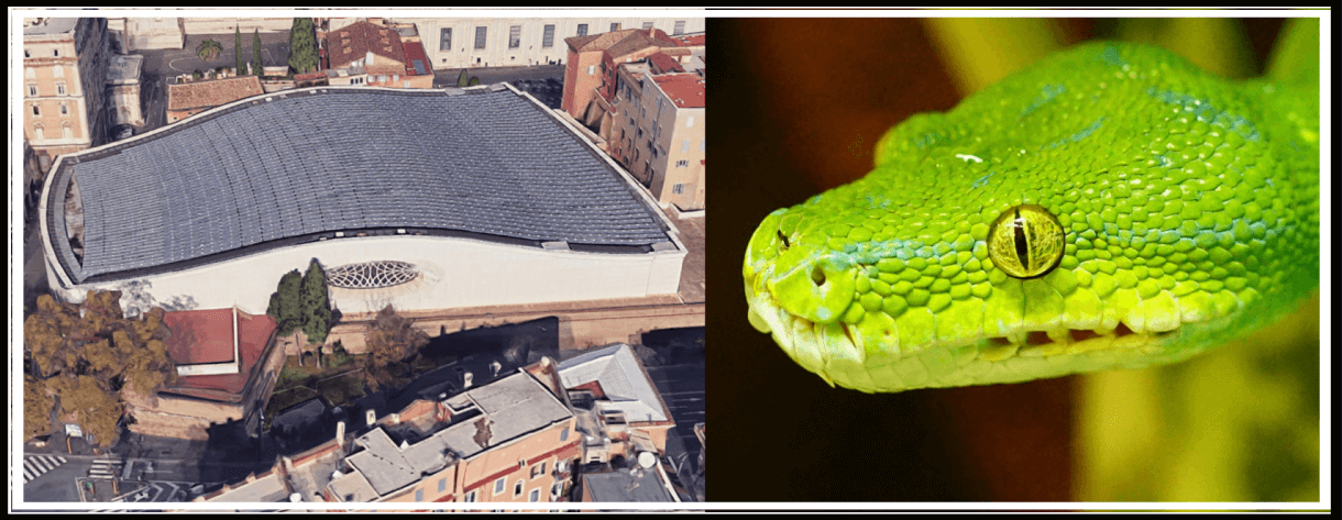 Как вы думаете, на что был бы похож храм, если бы его строили Рептилоиды? Ответ очевиден – в дизайне имелось бы масса отсылок к рептилиям. А теперь наложим на конструкцию такого храма некоторые ограничения, связанные с конспирацией. Что же мы получим? Получим мы не что иное, как… зал аудиенции Папы Римского!