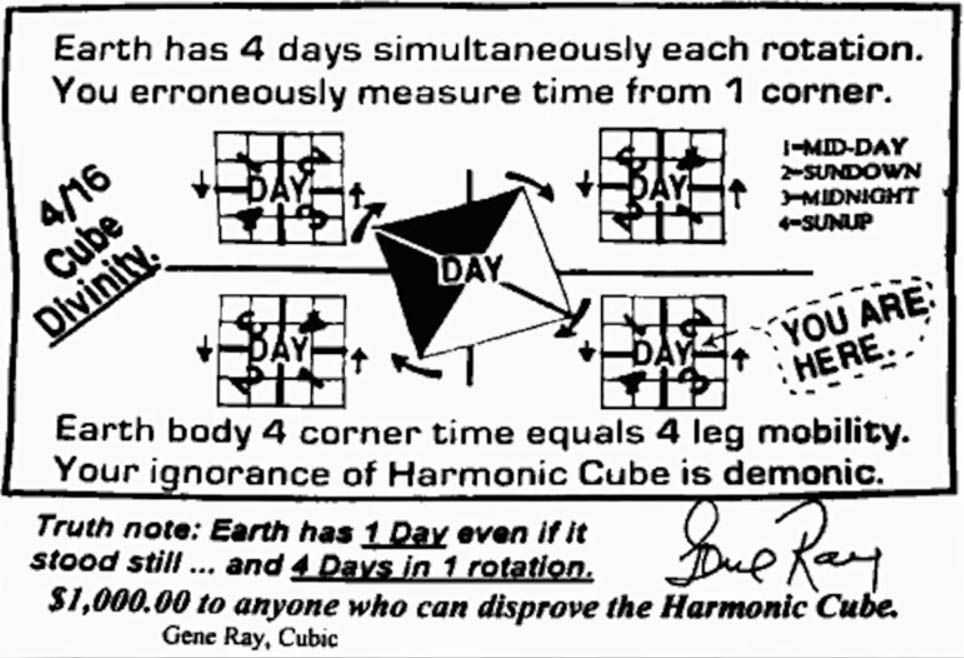 Эта донельзя странная концепция была обнародована в Интернете в 1997 году. Её автор — изобретатель Джин Рэй. Полностью идеи этого человека не удалось понять никому. К сожалению, уточнить непосредственного у него самого уже не получится — бедняга скончался в 2015-ом в возрасте 87 лет. Как бы то ни было, согласно представлениям Рэя, каждый день на Земле состоит из четырех других дней, протекающих одновременно, но имеющих собственные часовые пояса. Он также обвинял всех учёных в том, что они состоят в корпорации зла, которая внушает человечеству ложные представления об устройстве мира. Рэй предложил премию в размере 10000 долларов каждому, кто докажет его неправоту. Получить её желающих не нашлось, так как у старичка были очевидные проблемы с головой.