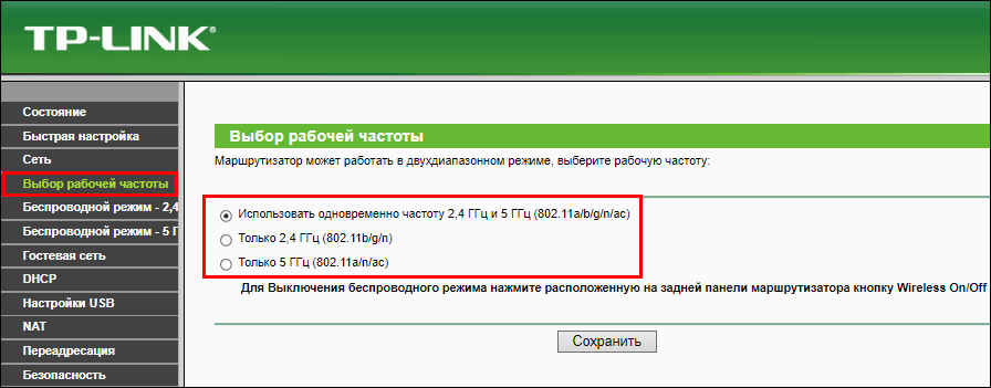 - Откройте раздел «Выбор рабочей частоты» (на некоторых роутерах он может находиться внутри раздела о настройке беспроводного режима) и отметьте, в каком диапазоне будет вещать ваша точка доступа.
