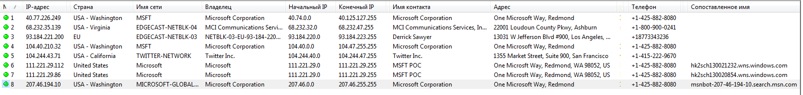 Это сети 40.74.0.0–40.125.127.255, 68.232.32.0–68.232.47.255, 93.184.220.0–93.184.223.255, 104.40.0.0–104.47.255.255, 104.244.40.0–104.244.47.255, 111.221.29.0/24 и 207.46.0.0/16. Их номерная емкость просто огромна. Судя по балансу входящего и исходящего трафика, служат они не только для доставки контента, но и для масштабного сбора данных.