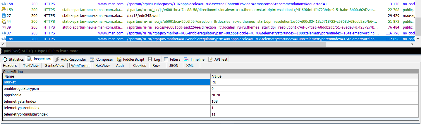 При настройке запуска Edge с чистой страницы трафик вообще был минимальным. Единственное, что слегка насторожило, — строка, содержащая записи и . Значения, отправляемые в ней на сервер , закодированы.