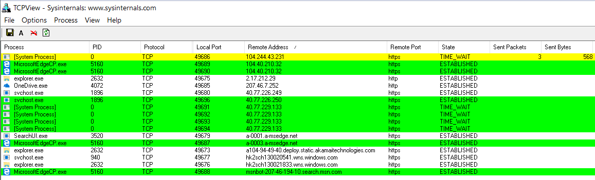 В тестах мы использовали Microsoft Edge 38.14, предустановленный в Windows 10 build 1607. Этот браузер интересен тем, что активен почти всегда. Даже если ты его не запускаешь, он появляется в памяти и устанавливает соединения с серверами Microsoft. В фоне преимущественно работает MSN-бот, а при запуске Edge на мгновение становятся видны соединения с семью основными сетями Microsoft.