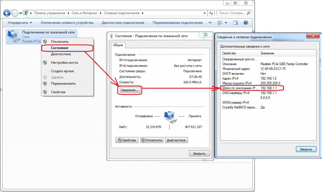 В окне состояния подключения нажимаем кнопку Сведения. В открывшемся окне сведений о сетевом подключении смотрим на «адрес Шлюза IPv4» — это и есть адрес роутера в локальной сети.