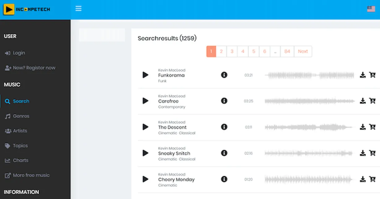Другой способ узнать, какие песни без роялти можно получить в Incompetech, – воспользоваться инструментом поиска. Список загрузок может быть отфильтрован по ощущениям (например, спокойный, ритмичный, возвышенный, бодрый, экшн, юмористический, темный), темпу (например, 90-120 или >150), жанру (например, фанк, полька, африканский, диско, джаз, блюз, праздник и город), и продолжительности.