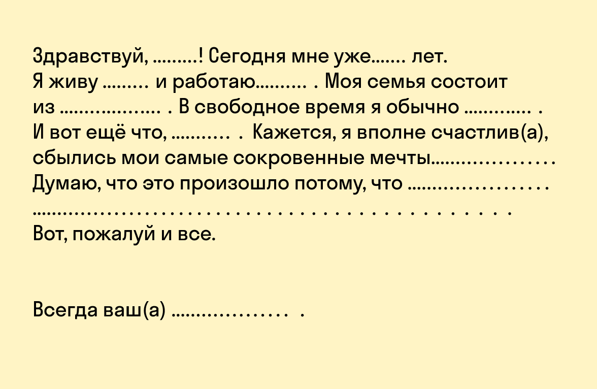 - Цели и стремления. К чему вы стремитесь? Каким вы видите себя в будущем? Чего вы ждете с нетерпением? Каковы ваши надежды и цели? Как вы рассчитываете измениться к моменту прочтения письма?