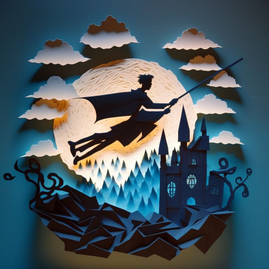 Harry potter on broomstick in sky, layered paper craft, paper art, diorama –v 4