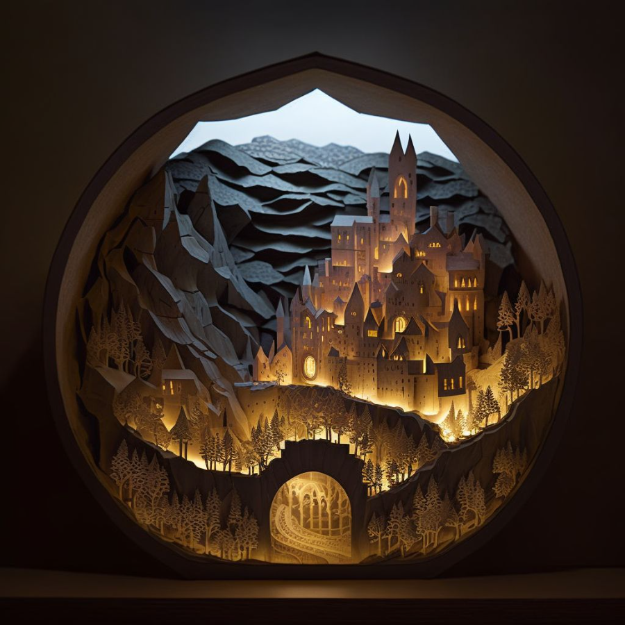 Hogwarts, castle on a hill, from Harry Potter, layered paper art, diorama, shadowbox, volumetric lighting –v 4