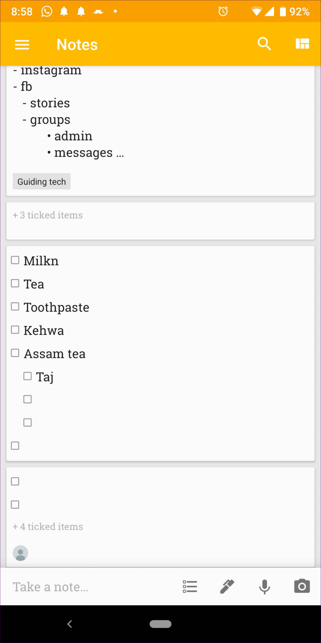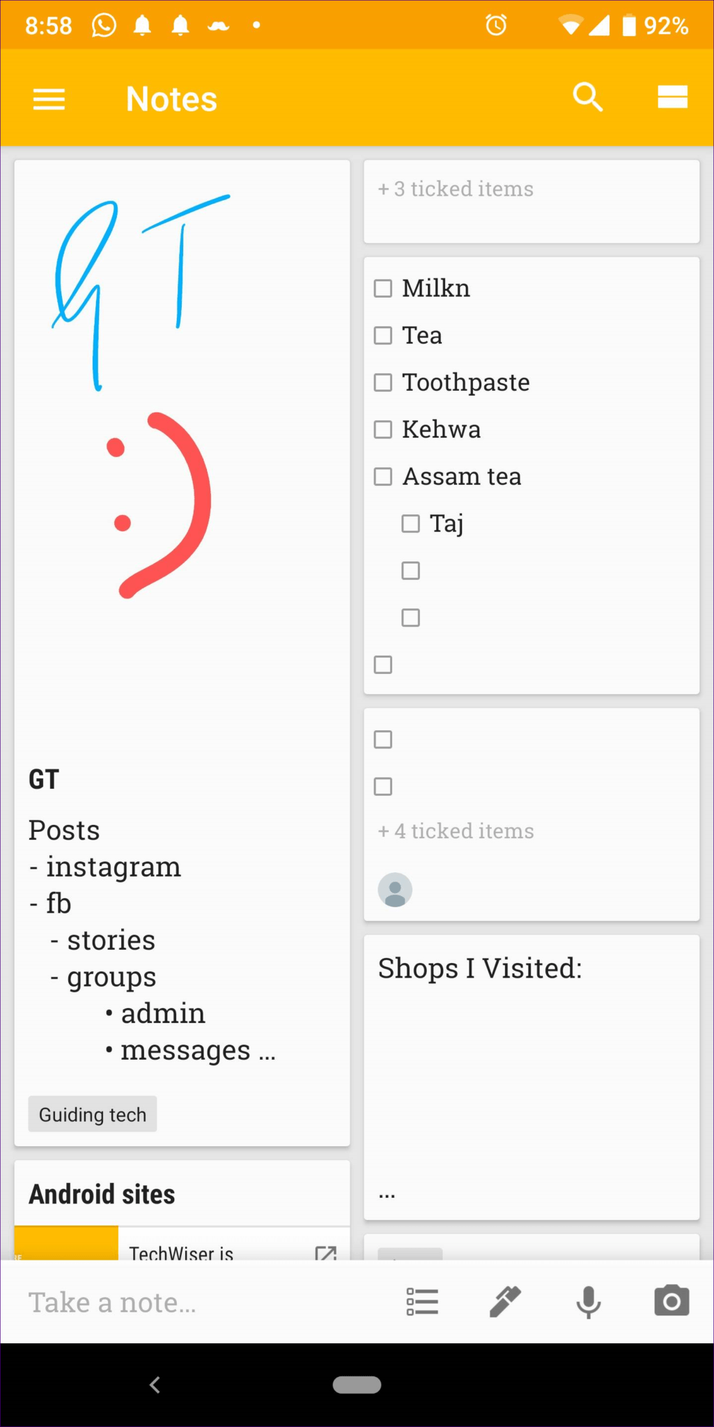 Пользовательский интерфейс Keep напоминает заметки в цифровом формате. Если вы использовали, домашний экран будет чувствовать себя знакомым с этим. Вы получаете макет карты с картами неправильного размера. На мой взгляд, он лучше всего подходит для веб-версии, а не для мобильных устройств. Но, да, у вас есть возможность изменить его на представление списка, в котором снова есть асимметричные элементы списка. Эти карты меняют размер в зависимости от длины заметки.