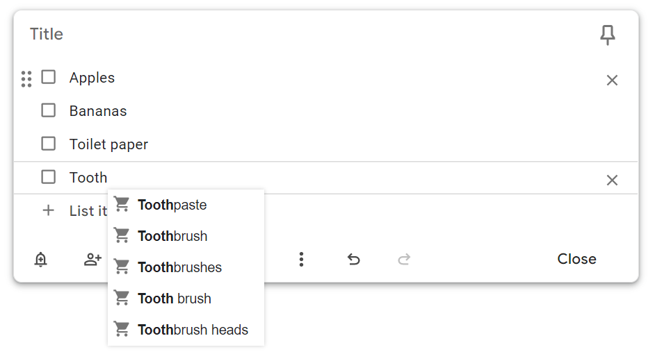 Creating checklists is wonderful. As you type your shopping list, you get suggestions. When you start typing «bananas» or «toilet paper,» you can tap to complete and save some time. As you mark those tasks as done, they’re grouped below the ones that are still to do, so you can focus on what’s left.