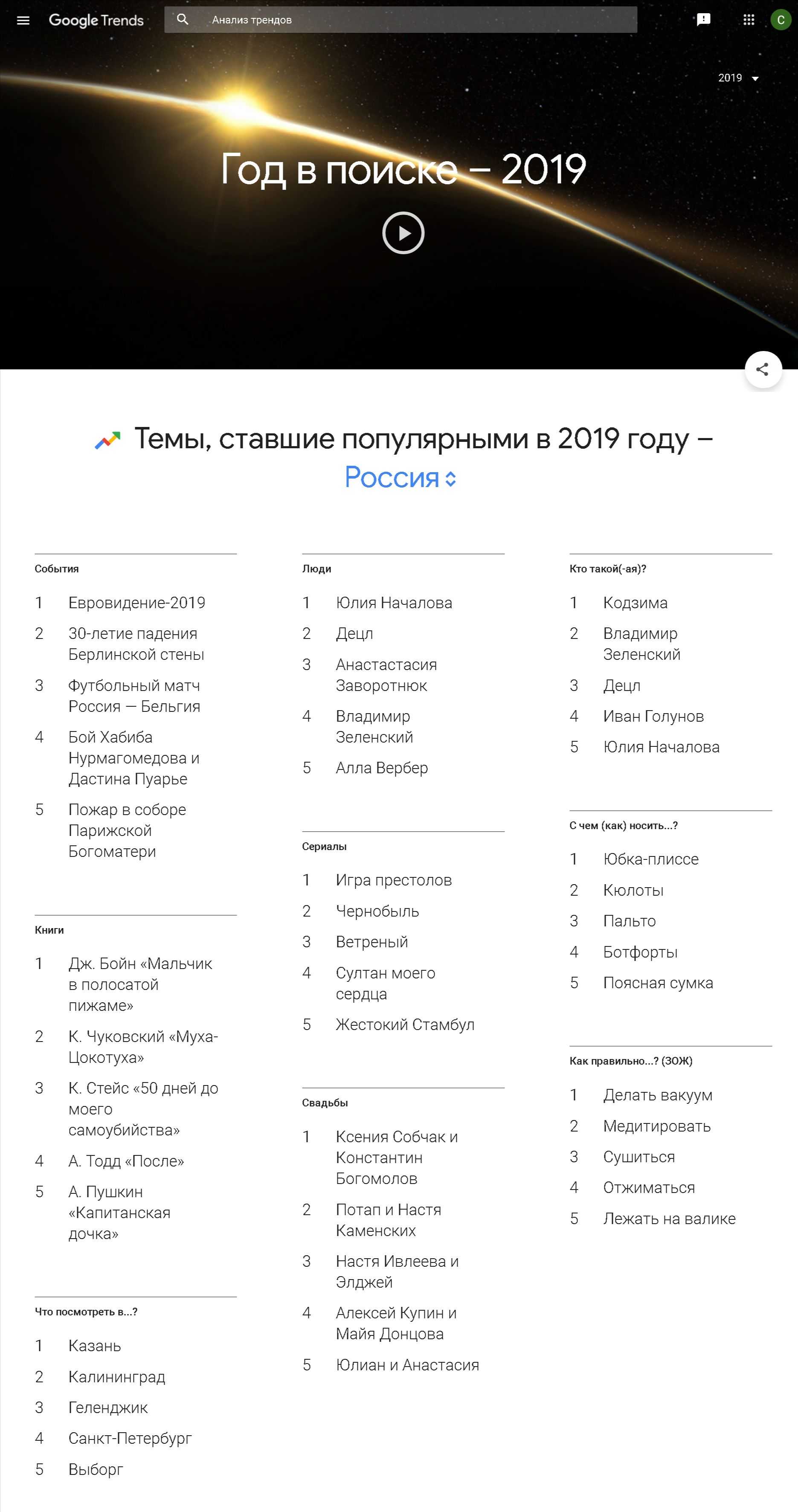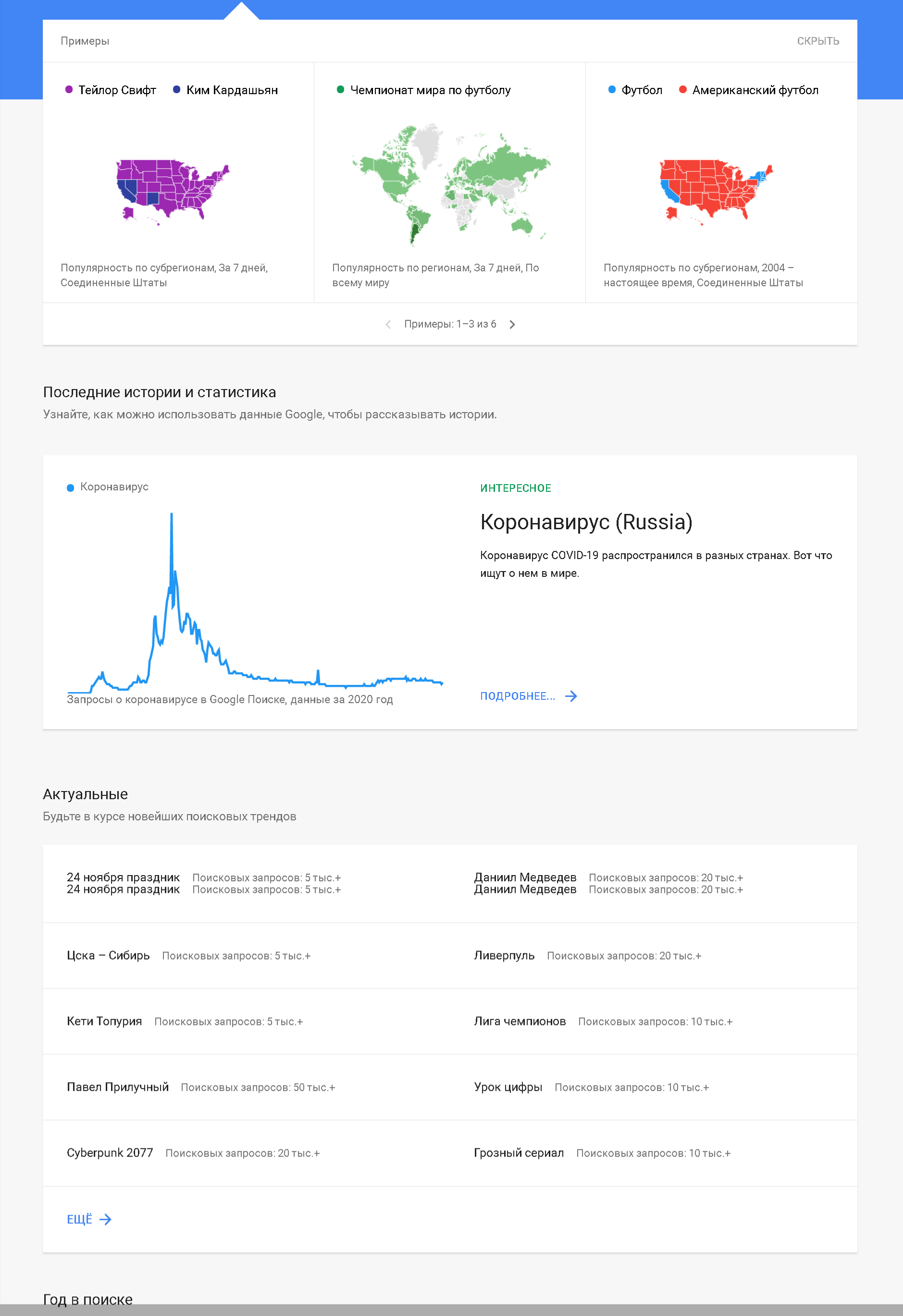 Дополнительный инструмент Google Trends, формирующий список самых популярных запросов начиная с 2001 года. Полезен при поиске идей для рекламных кампаний, анализа тенденций в статистике пользовательских предпочтений. Выбор периода доступен на главной странице, через контекстное меню.