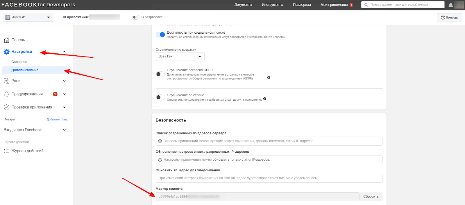 В <string>, содержащемся в ключе FacebookClientToken, замените CLIENT-TOKEN на значение из раздела дополнительных настроек Панели приложений «Маркер клиента».