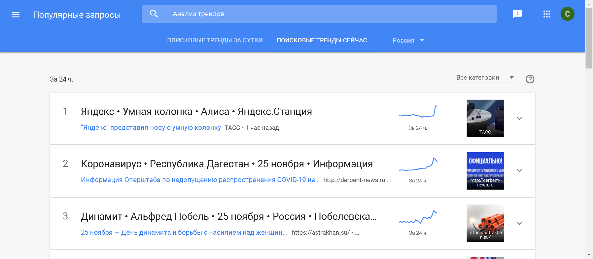 На главной странице в разделе «Актуальные» представлены наиболее популярные в запросах пользователей темы за последний час. Данные показатели помогают понять общие поведенческие тенденции интернет-аудитории, сформировать ситуативные поводы для рекламы, опирающиеся на наиболее востребованные инфоповоды. Вполне очевиден пример, который стоит на первом месте по всему миру – проблема распространения коронавируса.