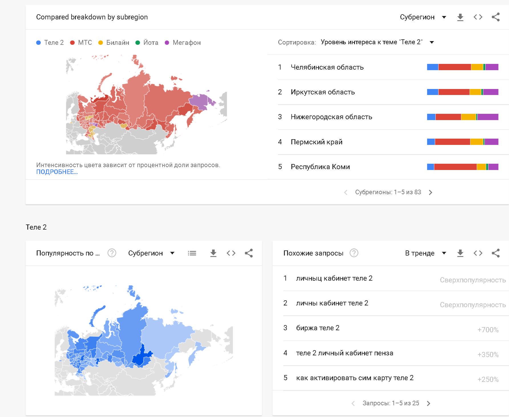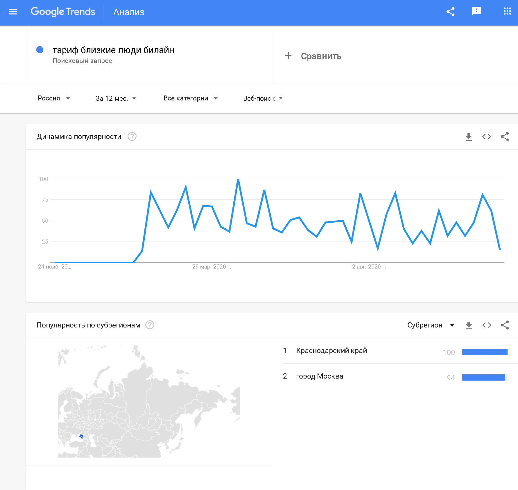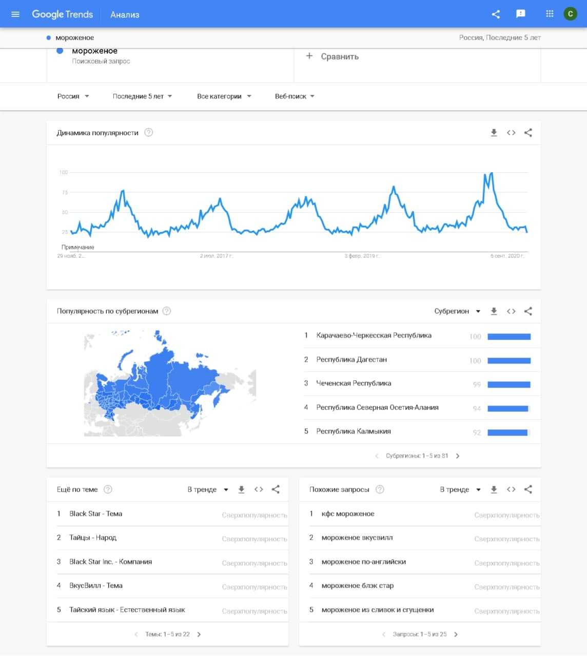 Для некоторых товаров большое значение имеет сезонный фактор. С помощью аналитики Google Trends в разделе «Анализ» можно отследить динамику запросов во времени и сделать выводы о сезонности товара или услуги. Для этого нужно выбрать достаточно длительный период (желательно несколько лет) и посмотреть на графике динамику популярности запросов по продукции. В случае зависимости от годовых периодов станет наглядно видна тенденция подъема и падения спроса. Соответственно, планировать рекламную активность логично в привязке к пиковым периодам. Инструментарий позволяет определить лидирующие запросы по трендам, выбрать субрегион внутри страны.