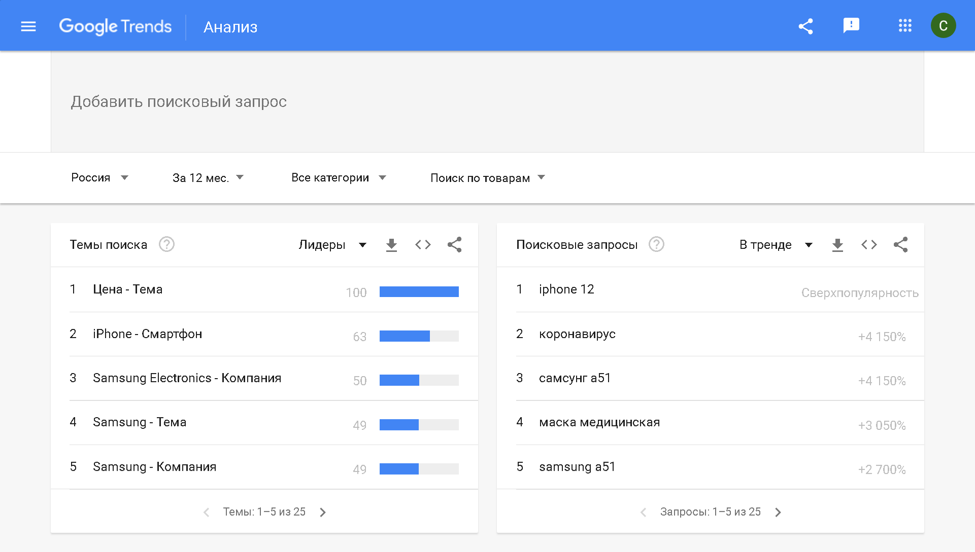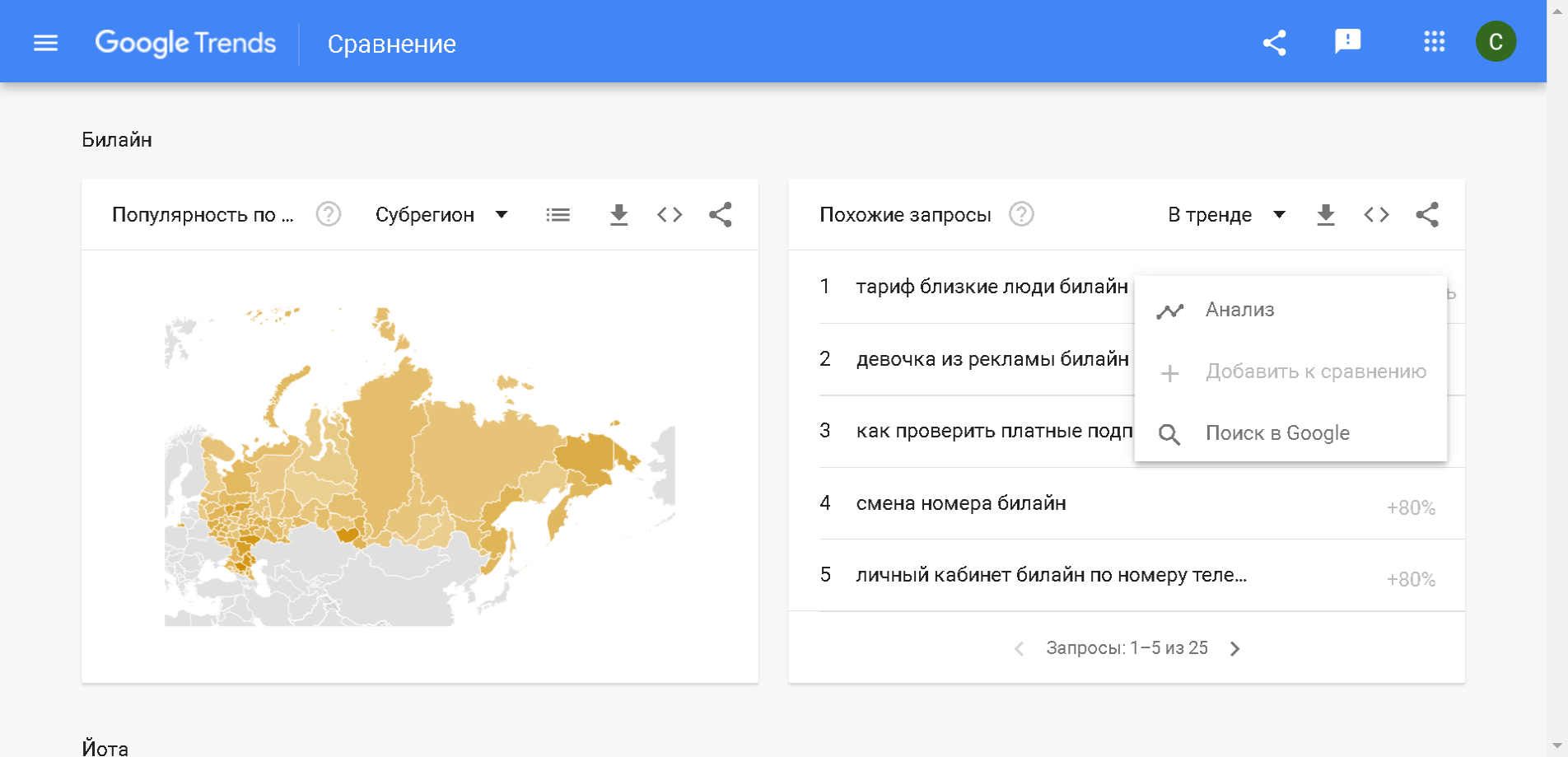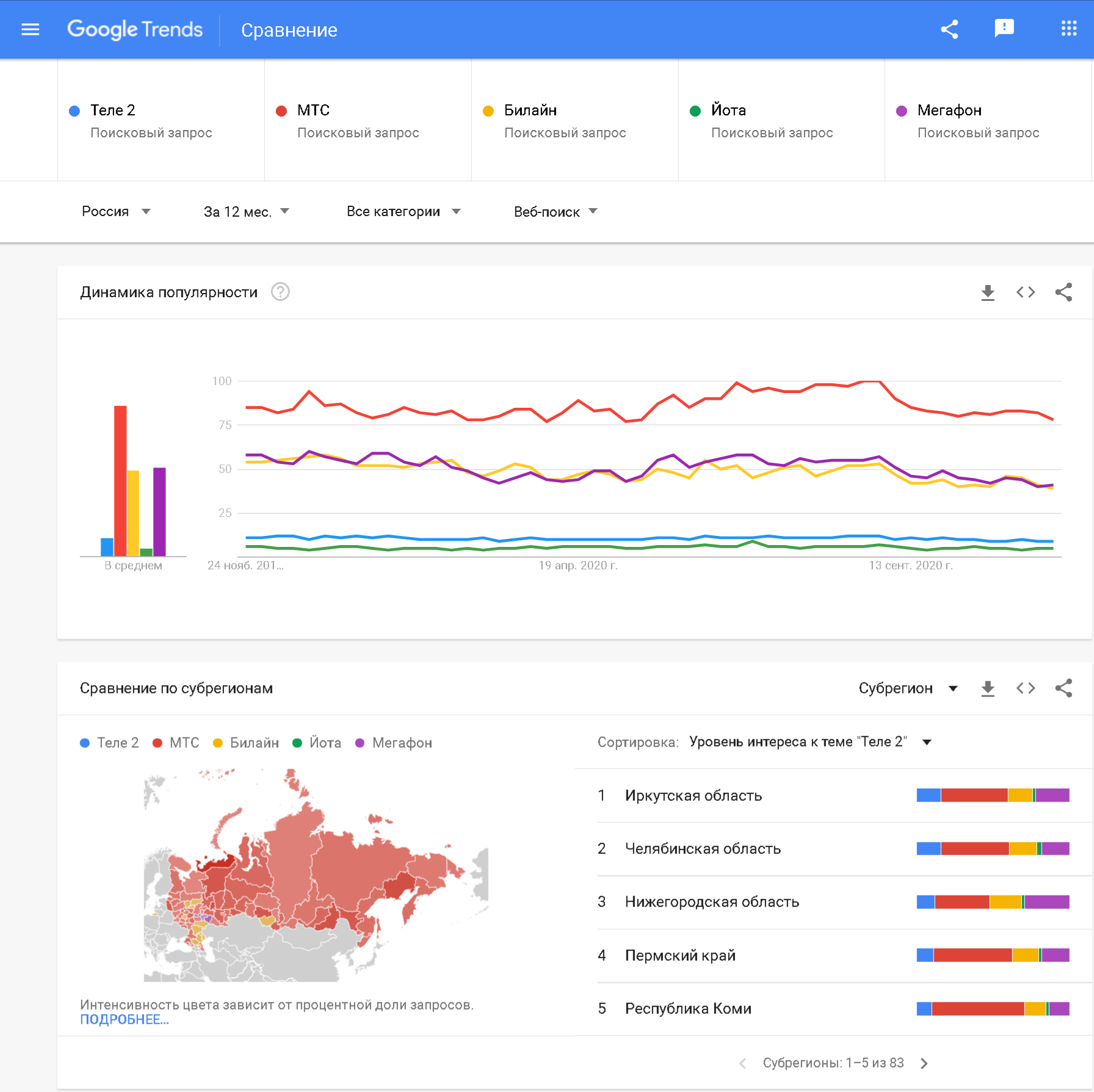 Для некоторых товаров большое значение имеет сезонный фактор. С помощью аналитики Google Trends в разделе «Анализ» можно отследить динамику запросов во времени и сделать выводы о сезонности товара или услуги. Для этого нужно выбрать достаточно длительный период (желательно несколько лет) и посмотреть на графике динамику популярности запросов по продукции. В случае зависимости от годовых периодов станет наглядно видна тенденция подъема и падения спроса. Соответственно, планировать рекламную активность логично в привязке к пиковым периодам. Инструментарий позволяет определить лидирующие запросы по трендам, выбрать субрегион внутри страны.