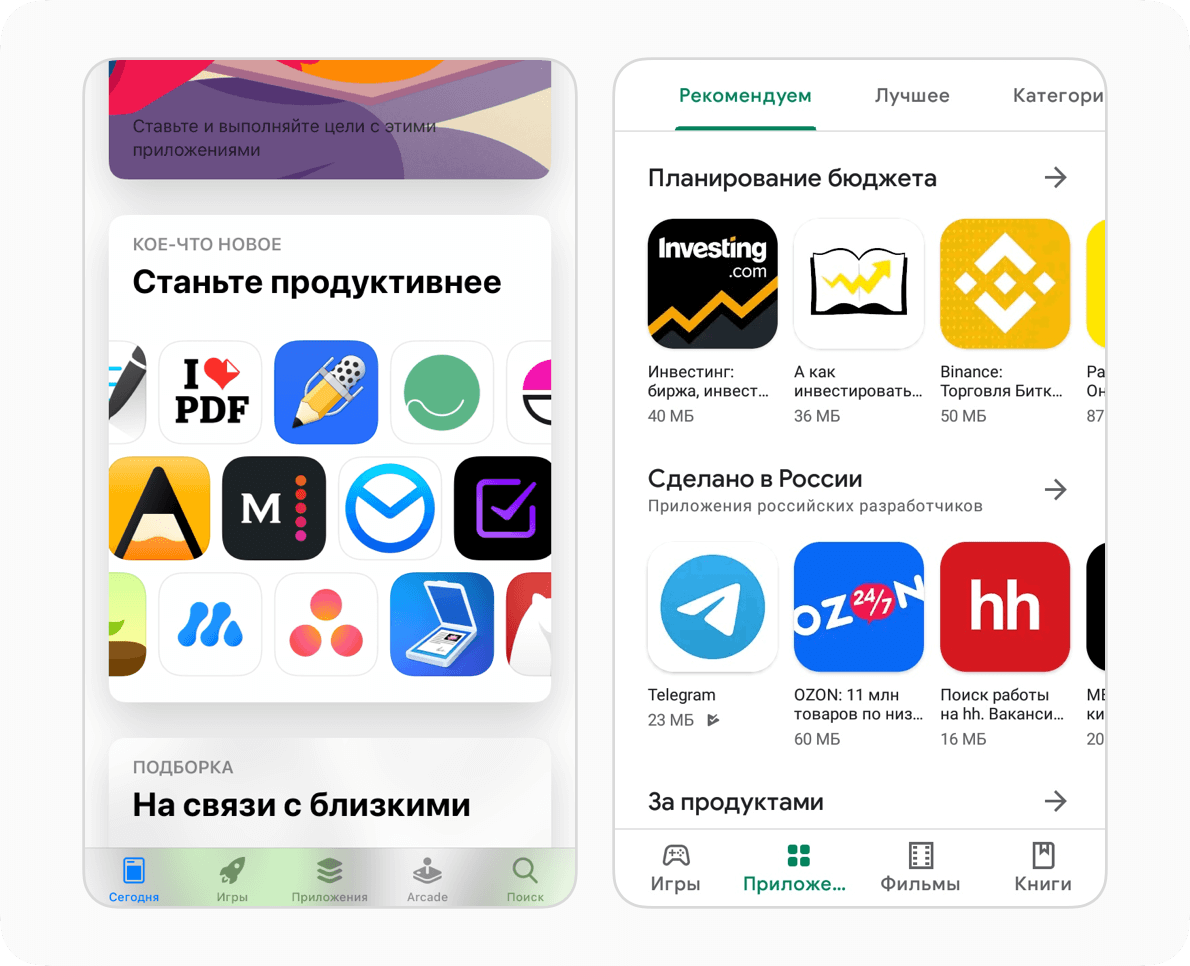 Фичеринг продвигает приложение бесплатно и за вас: показывает приложение в подборках на первом экране стора. В App Store — это тематические подборки, в Google Play — персонализированная подборка «Рекомендуем» и подборки «Лучшее», «Выбор редакции», «Для всей семьи».