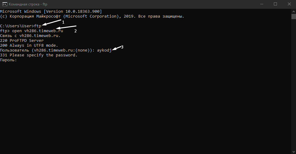 - Задаем команду open наименование_ftp_хоста.