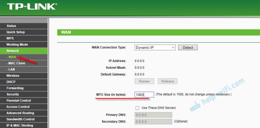 Сменить MTU можно в настройках роутера, в разделе с настройкой подключения к интернету: «WAN», «Интернет».