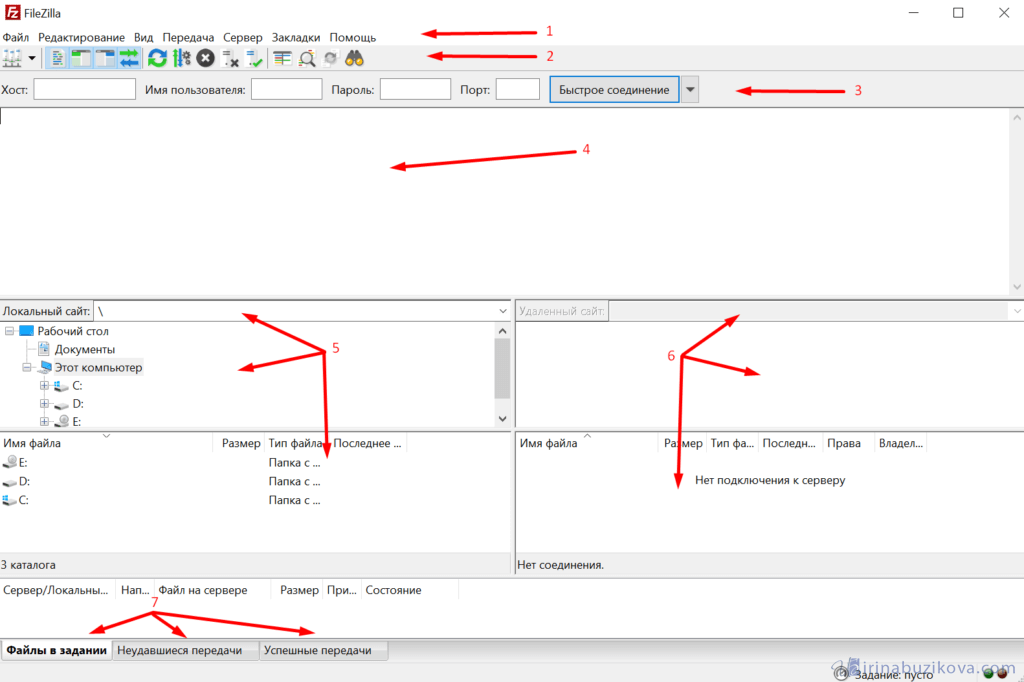 Файлзилла имеет достаточно простой и понятный внешний вид приложения. Окно программы можно разделить условно на семь частей. С каждой познакомимся подробно.