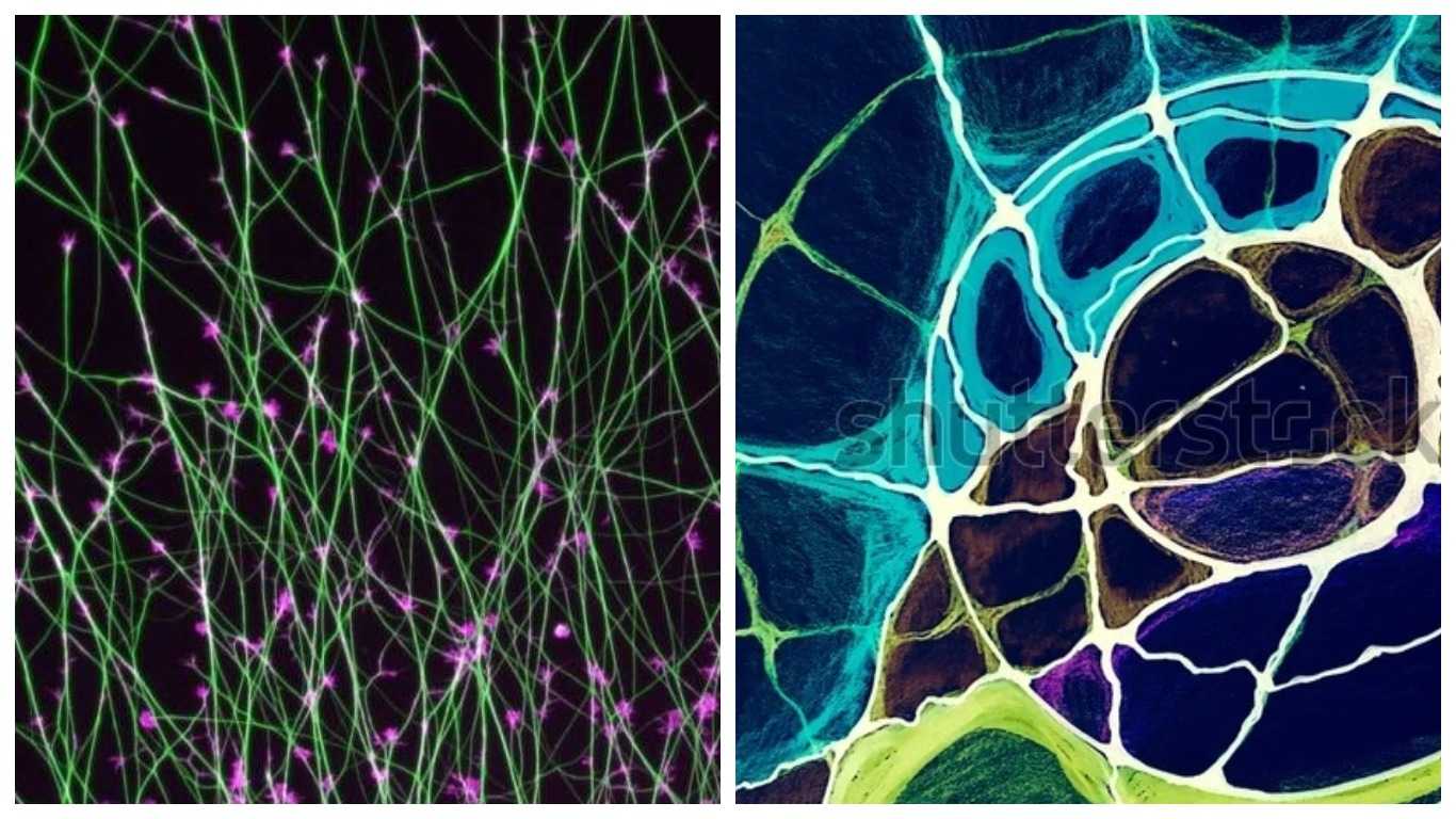 Слева — реальное фото растущей нейронной сети в эмбриональном мозге из лаборатории, справа — рисунок, выполненный по нейрографическому алгоритму.