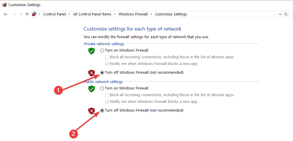 - Нажмите «Отключить брандмауэр Защитника Windows» в разделе «Параметры частной сети» и «Параметры общедоступной сети».