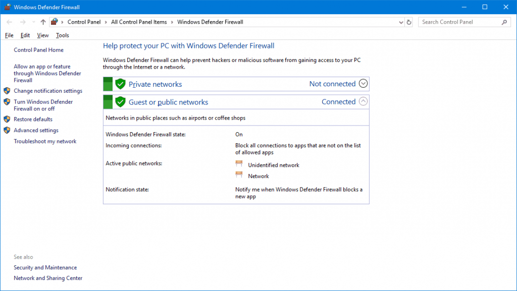 Нажмите Включить или выключить брандмауэр Защитника Windows, чтобы открыть параметры брандмауэра, указанные ниже.