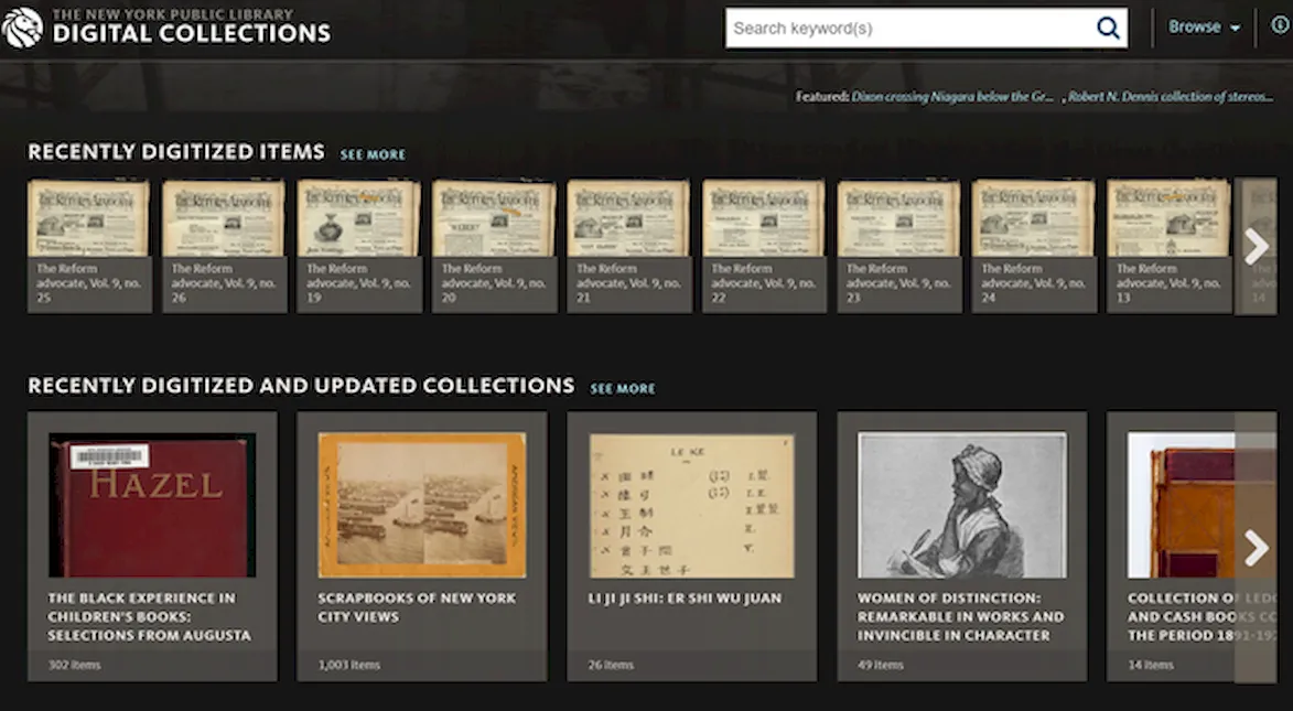 Публичная библиотека Нью-Йорка организовала огромную коллекцию удивительных изображений и сделала их доступными для общественности. Эта коллекция включает в себя иллюстрированные рукописи, исторические карты, старинные плакаты, редкие гравюры, фотографии и многое другое.