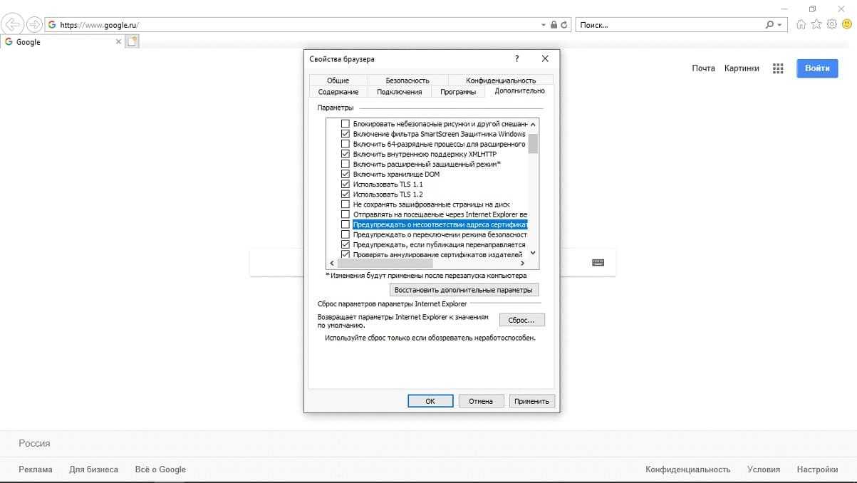 Вообще, игнорировать такие сообщения не рекомендуется, однако, если вы полностью уверены в сайте и его содержимом – проблем возникнуть не должно, а сообщение можно отключить. Для этого нужно нажать на иконку шестеренки в правом верхнем углу, открыть свойства браузера, выбрать вкладку “Дополнительно” и снять флажок с окна “Предупреждать о несоответствии адреса сертификата”