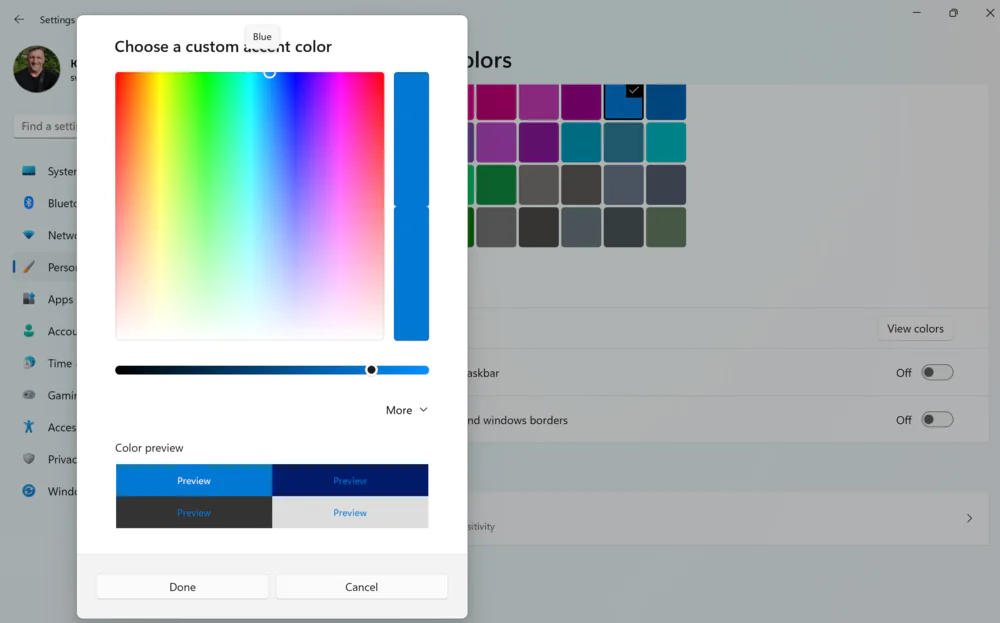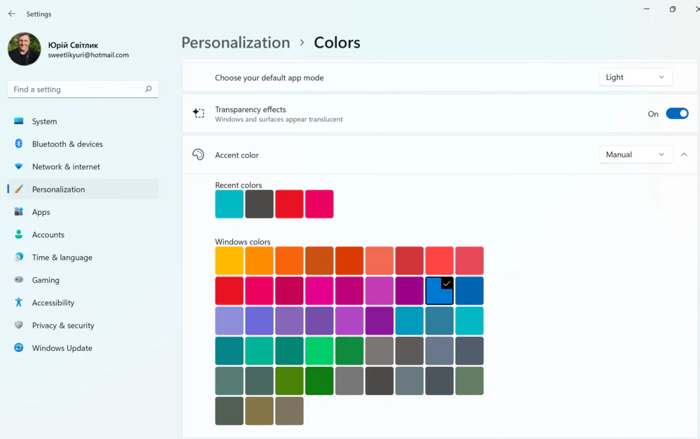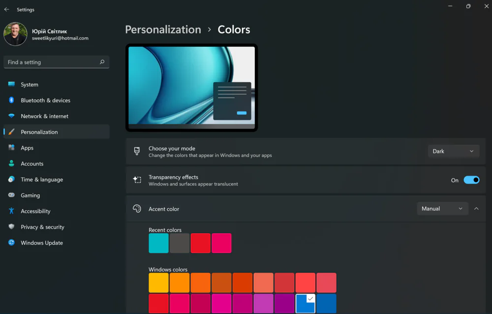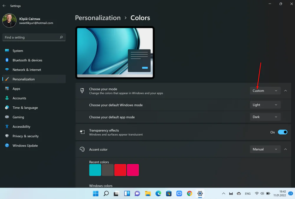 Есть еще и пользовательский режим, который позволяет выбрать цветовой режим для приложений и системы отдельно. В Пользовательском режиме у вас также есть возможность немного поиграть с красками, палитра цветов здесь действительно поражает. Каждый найдет свой цвет, а если и этого мало, то можно самостоятельно выбрать даже нужный оттенок.