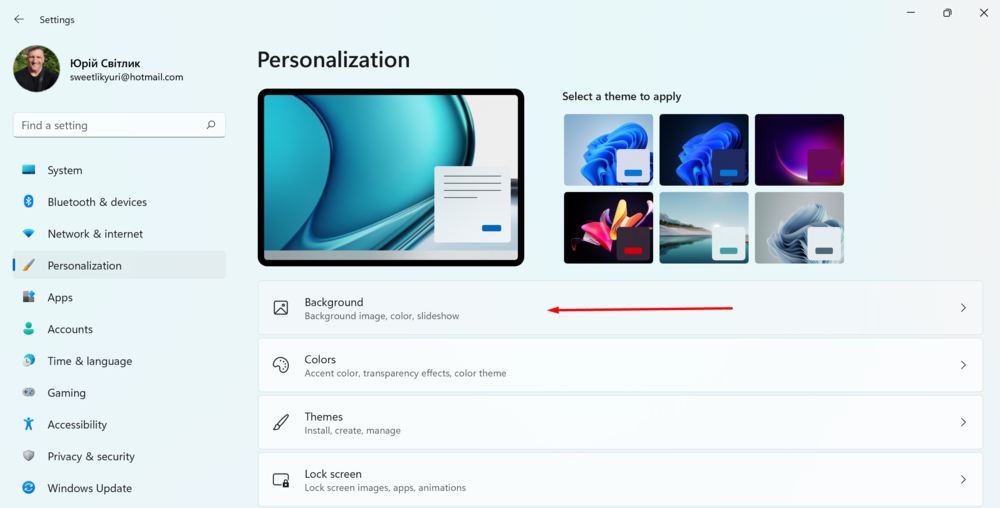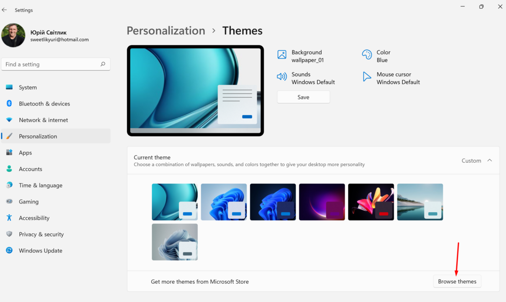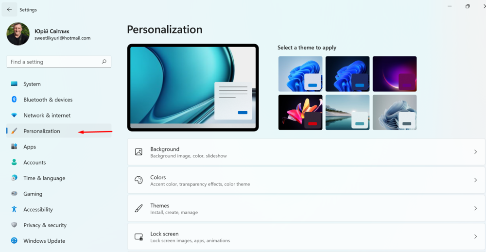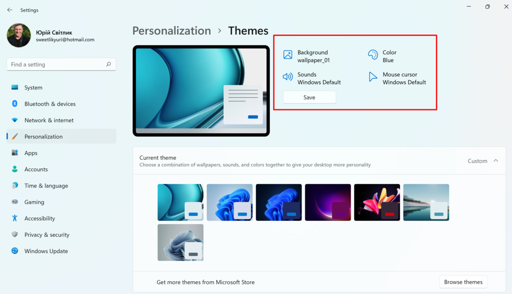 Для этого есть специальный раздел Темы. Именно здесь уже есть готовые темы для интерфейса Windows 11. Вы просто выбираете понравившуюся, кликаете на нее, и она уже автоматически становится заданной темой для вашего ноутбука. Самостоятельно можно настроить звуковое и цветовое сопровождение темы.