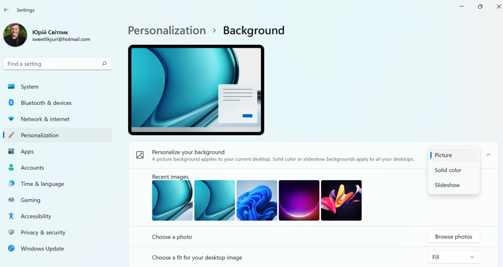 У вас есть возможность также установить свое фоновое изображение или папку фотографий для слайдов. Для этого нажимаете на Обзор фото, выбираете нужную фотографию или папку, и ваш Рабочий стол получит фоновое изображение вашего отдыха на море или семейного фото. Ограничений нет. Главное, чтобы эти фотографии уже были на вашем устройстве.