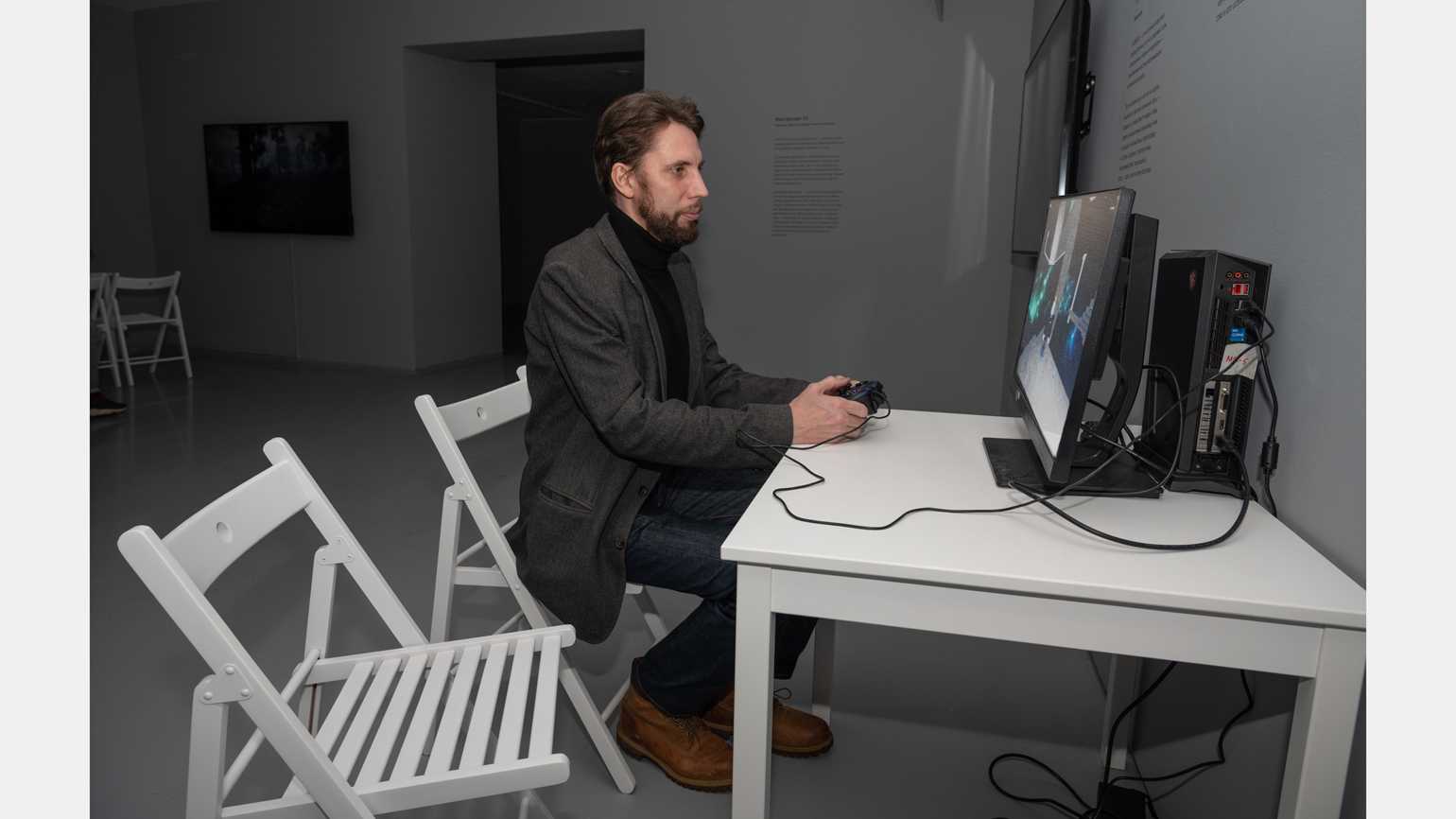 Руководитель студии Ice-Pick Lodge Николай Дыбовский на открытии биеннале «Искусство будущего» в МАММФото: страница Ярослава Кравцова в